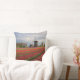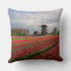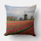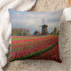 Coxim quadrado do travesseiro decorativo da foto com uma paisagem do primavera com um campo com tulipas vermelhas e outras flores e um moinho de vento durante o nascer do sol nos jardins de Keukenhof, região do bulbo, os Países Baixos.
