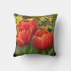 Este travesseiro atraente apresenta lindas tulipas vermelhas laranja com forsitia no fundo.