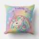 Este travesseiro decorativo personalizado bonito e colorido apresenta uma bela ilustração de um arco-íris unicórnio e colorido pastel sobre um fundo de gradiente do arco-íris. A brilho dourada escura acentua as porções superior e inferior. Pequenas estrelas em cores compatíveis rodeiam o arco-íris. Uma faixa é impressa acima do unicórnio com um nome de exemplo impresso abaixo em uma fonte elegante de script púrpura. Você pode personalizar o travesseiro para incluir seu próprio nome personalizado ou texto.