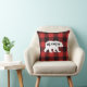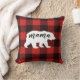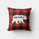 Excelente além do decor do Partido Feriado ou durante todo o ano na cabana de madeira, este travesseiro decorativo corresponde aos nossos outros convites para férias de maré gingham e outros acessórios. A design apresenta um padrão de flanela vermelho e preto listrado atrás de um urso branco que tem o texto preto "Mama" na frente. A parte de trás apresenta o mesmo padrão de xadrez com três árvores brancas na parte de trás.