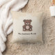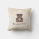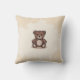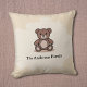 Um travesseiro com ilustração de um ursinho de pelúcia sobre fundo colorido. Uma boa ideia de presente para uma família ou uma criança!