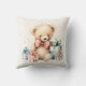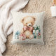 Um travesseiro com uma bela ilustração com um ursinho de pelúcia estilo vitoriano. Vestindo um arco vermelho rico. Desenhado em um estilo vintage bonito e antigo. Presentes de Natal pastel vermelho e azul rodeados por este urso de coração quente.