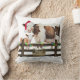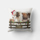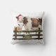 Galinha branca com bezerro e vestindo um chapéu de Papai Noel por cerca rústica com luzes de férias e sinal.