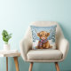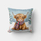 Este lindo travesseiro decorativo sazonal de Natal que tem uma ilustração do estilo aquarela de um bebê Highland Cow sentado num campo de neve balbuciosa durante um dia de inverno com um pano de fundo de pinheiros decorados em férias.
