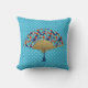 Um travesseiro decorativo de fã japonês Art Deco em um padrão crisântemo tradicional e estilizado usado em têxteis japoneses, em tons de azul, turquesa e vermelho brilhante, esboçados em ouro, em azul escuro, com base em ouro emboscado e um fundo com padrão de deco coordenado
