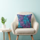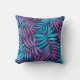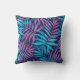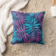 Vistas frontal e traseira de uma almofada com um vibrante padrão de folhas. Folhas em tons de rosa e azul cobrem um fundo escuro, criando um ambiente tropical.