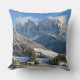 Travesseiro decorativo com o St. Magdalena da vila (papai noel Maddalena) com sua igreja no Villnoesstal em Tirol sul, Italia, na neve durante o inverno.