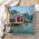 Travesseiro decorativo com uma paisagem com os boathouses na vila de Fjærland (Mundal) e montanhas com reflexão na água do fiorde Fjærlandsfjord, og Fjordane de Sogn em Noruega.