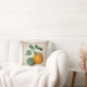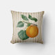 O travesseiro decorativo de aparência da safra apresenta uma ilustração botânica em pêssego sobre o fundo estriado em castanho e branco