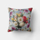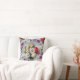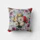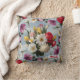 É um travesseiro decorativo com uma ilustração de uma variedade de flores. Há rosas, margaridas, lírios e tulipas em diferentes cores como vermelho, branco, amarelo e rosa. As flores são dispostas em um padrão circular, com as maiores flores do centro e as menores, aos poucos, diminuindo à medida que se deslocam para fora. O fundo é um céu azul claro com nuvens brancas e peludas.