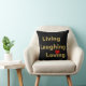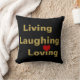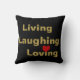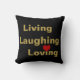 Travesseiro decorativo preto e ouro inspirador "Vivendo, Rindo e Adorando". O texto dourado e a cor de fundo podem ser alterados pelo cliente. Por celeste@khoncepts.com