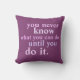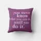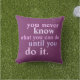 "Nunca se sabe o que se pode fazer até o fazer." Citação de inspiração em um travesseiro roxo! Citações inspiradoras e motivacionais para as mulheres, para autoconfiança e sucesso, letras ousadas em tons pastéis de rosa e roxo, palavras de vários tamanhos para pizzazz extra.