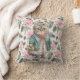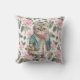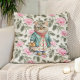 Travesseiro decorativo com a pintura vintage de um gato vovô fofo vestindo e um avental floral rosa e um suéter verde.