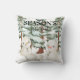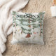 Whimsical watercolour illustration of three snowmen in a snowy forest, surrounded by evergreen pine trees, with a holiday message of "Season's Greetings. Perfect holiday cushion for all the family this Christmas.