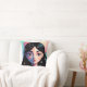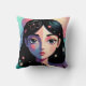 This decorative throw pillow features a captivating, whimsical portrait of a girl with long dark hair, accented by delicate white and pink flowers. The design showcases a modern artistic style with a soft, multi-colored background of teal, pink, and violet tones. This high-quality pillow adds a vibrant and artistic touch to any bedroom, living room, or creative studio space.