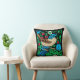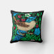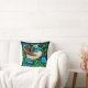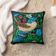 Travesseiro decorativo em um padrão de azulejo William Morris Art Nouveau, melhorado digitalmente e colorido, representando uma ave de bege mole e castanho, com flores azuis vivas, cerulanas, folhas verdes e morangos selvagens, contra fundo preto