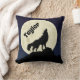 Mostre seu lado selvagem com este travesseiro decorativo personalizado. Ele mostra um estilo silhueta ilustrando um lobo em preto uivando em uma lua amarela pálida contra um fazer de fundo do céu azul-da-noite perfeito para qualquer um que ama animais. Este travesseiro está pronto para ser personalizado com um nome ou outro texto.