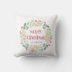 Este travesseiro de Natal elegante e na moda apresenta uma coroa colorida com folhas verdes e douradas e amoras vermelhas, bem como uma tipografia com a mensagem "Feliz Natal" num fundo branco.