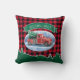Adicione o seu nome familiar a este travesseiro de Natal com uma cena de inverno de um clássico caminhão vermelho a conduzir através da neve, uma nova árvore de Natal no fundo. Uma faixa verde acima tem um nome de família para você personalizar com o seu próprio nome. O fundo é um padrão de verificação de búfalos vermelho e preto com uma borda de pinheiros verdes. A parte de trás do travesseiro é a verificação de búfalos vermelho e preto.