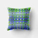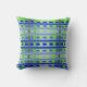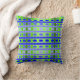 Este travesseiro decorativo tem um design geométrico de linhas em tons azuis e verdes tecidos para fazer uma xadrez.