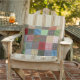 Design de retalhos rústicos decorativos em tons azuis-claros, vermelhos, verdes, brancos e cinza para casa e terraço do campo.