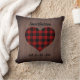 Belo travesseiro decorador estilo country com um coração de xadrez de búfalo vermelho e preto em um fundo de madeira rústica. Adicione o nome da sua família e a data do casamento.
