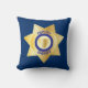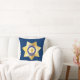 Diversão do travesseiro com um grande crachá de estrelas de ouro do xerife na frente, em um fundo azul profundo. Na parte traseira do travesseiro, há um padrão da mesma estrela dourada.