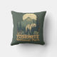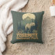 O travesseiro decorativo na moda apresenta uma vinheta retrorreflectora do Parque Nacional de Yosemite, na Califórnia, sobre o fundo verde da floresta desbotada.