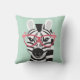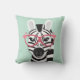Um travesseiro decorativo que é peculiar e divertido e apresenta uma zebra (mostrando o rosto e o pescoço) que está vestindo um par de óculos escuros rosa com flamingo e está na frente de um padrão verde de eríndio.