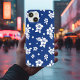 Mostra um padrão de flores clássico de Aloha hibiscus havaiano sem problemas. As flores são brancas e o fundo é azul. Legal maneira de entrar num relaxado humor havaiano Aloha, para lembrar de férias, para havaianos, americanos, turistas, e até para jardineiros.