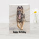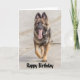 Cartão do feliz aniversario que caracteriza uma fotografia de um Alsatian do cão de german shepherd que trota feliz ao longo de um Sandy Beach.