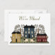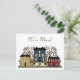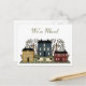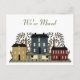 Trabalho de arte de casas, árvores e ovelhas coloridas primitivas do país. Mudamos o texto verde mudo no topo do cartão de posto. Personalize todo o texto de frente e de volta para atender às suas necessidades.