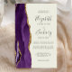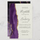 A borda esquerda deste elegante convite de casamento moderno apresenta uma cor d'água roxa, borda agitada, aparada com falso brilho dourado. O texto personalizável combina a escrita manual de cinzas de carvão, as fontes em copperplate e itálico em um fundo de marfim. O verso apresenta um design de agate roxo e dourado correspondente.