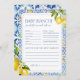 Inspirada pelo encanto da Costa Amalfi, esta Cartão de Predictions & Advice apresenta limões de aquarelas, padrões de azulejos mediterrânicos e uma elegante tipografia azul. Um jogo divertido e na moda para manter os convidados envolvidos durante o seu chá temático dos citros italianos.