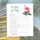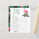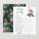 O design de convite para chá de fraldas apresenta flamingo cor-de-rosa com frondes verdes de palma e flores de hibisco tropicais. "Aloha Baby". Um padrão floral tropical com cor preta de fundo se veste na parte de trás do cartão.
