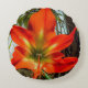 Esta Almofada Redonda apresenta a beleza intensa de uma flor, uma Amaryllis desabrochando no jardim. A fotografia original de ZoeSPEAK é um closeup, e os detalhes da flor, as formas e mudanças de cor do centro para fora são incríveis. De tons suaves de verde misturando-se ao amarelo, a flor termina com cinco pétalas estendidas em laranjas profundas e ricas contra um fundo de folhas verdes e madeira marrom suave.