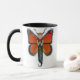 Âmbar a borboleta de monarca, dramática em uma caneca preta do punho.