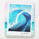 Uma representação vibrante de uma poderosa onda oceânica em tons de azul é capturada dentro de uma estrutura em estilo Polaroide, colocada contra um fundo de paisagem sazonal tranquilo. A frase "Ame o Oceano" está elegantemente inscrita abaixo da onda.
