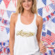 Celebrate the Semiquincentennial in effortless style with this elegant America 250 gold script patriotic tank top, designed for women who want versatility, comfort, and a polished look. The soft white fabric and metallic gold lettering make it easy to dress up for work or wear casually for summer gatherings.