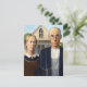 Este é o clássico quadro Grant Wood, American Gothic, mostrando um fazendeiro e sua esposa parados em frente à sua fazenda, ele com seu garfo de jarra, sua olhando de lado para ele.