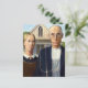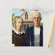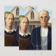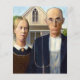 Este é o clássico quadro Grant Wood, American Gothic, mostrando um fazendeiro e sua esposa parados em frente à sua fazenda, ele com seu garfo de jarra, sua olhando de lado para ele.