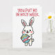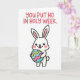 Este cartão mostra uma simples ilustração digital de um personagem semelhante a um coelho branco de orelhas compridas 🐰 em pé contra um fundo branco simples. Tem olhos minúsculos em pontos pretos, bochechas rosadas arredondadas e um sorriso aberto com uma pequena língua à mostra, dando-lhe um visual doce e amigável que parece ser destinado a alguém próximo. O personagem segura um ovo oval num abraço suave, como se estivesse a acariciar um pequeno presente para um amigo ou alguém de quem gosta. O ovo é decorado com faixas onduladas e fluidas de azul pastel, rosa suave e amarelo solar, adicionando um toque de primavera 🌷. Perto do topo, uma curta mensagem está acima do personagem em letras arredondadas em estilo de bolha, coloridas de rosa brilhante. O texto está centrado e espaçado de forma a parecer que está a falar diretamente para o coelho abaixo, adicionando um calor leve e zombeteiro à cena. As bochechas do coelho são