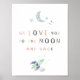 A Poster da enfermaria "Nós te amamos à lua e às costas" é uma peça decorativa de arte de parede normalmente usada no berçário de um bebê. A poster apresenta um design adorável e uma mensagem sincera de amor e afeto, com as palavras "Nós te amamos à lua e às costas" exibidas de forma proeminente. Esta poster é uma maneira charmosa e sentimental de mostrar seu amor pelo seu pequeno e adiciona um toque quente e convidativo a qualquer berçário.