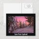Cartão postal com um céu cor-de-rosa durante um pôr do sol sobre árvores de abeto cobertas de neve em uma floresta em Lapland no inverno com uma fronteira negra e o texto: "Amor da Lapónia".