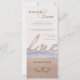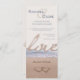 Este belo convite de casamento mostra uma foto de dois corações abaixo de uma onda oceânica na areia. A palavra "amor" em uma fonte de roteiro separa a foto do resto do simples convite de cor creme, onde palavras azuis escuras do oceano em uma fonte clássica, em estilo gravador, convidam convidados para o seu casamento. Todo texto exceto "amor" é personalizável no convite.