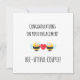 Este cartão de noivado engraçado com trocadilho de amor de abelha fofa com tema de abelha é perfeito para enviar seus mais calorosos votos de noivado para um parente ou amigo noivo. Com um doce trocadilho de amor e sinceras congratulações de noivado, este cartão incorpora seus calorosos parabéns enquanto eles caminham em direção ao dia do casamento. As citações de noivado divertidas e o design inspirado em abelhas tornam-no uma escolha deliciosa para celebrar o amor deles. Na frente do cartão, está escrito calorosamente: “Parabéns pelo noivado. Casal bee-uto.” No verso, acrescenta-se de forma divertida: “Estou zumbindo de alegria com o seu noivado!” Você também pode personalizar este cartão para o seu familiar ou amigo que está noivo, tornando-o ainda mais especial e significativo. Este cartão é a combinação perfeita de sinceras congratulações e um toque de capricho