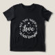 "Amor e Cachorros" A Camisa De Três-Blendas Da Camisa T. Texto Branco, Mensagem de Amor, Roupa de Amantes de Cachorro. Uma t-shirt preta com um gráfico circular branco com a frase "TUDO O QUE PRECISAMOS É DE AMOR E CÃES", destacada por corações e estampas de patas. Esta roupa apela aos entusiastas dos cães e promove o amor como um sentimento essencial.