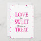 Este moderno sinal de "Amor é Doce e Trate" apresenta um fundo magenta cor-de-rosa com confete metálico. O texto é escrito em uma mistura de uma letra de caligrafia lúdica e uma fonte serif moderna. POR FAVOR NOTA _____________________________________________________________________________________ A cor metálica não é real, apenas um efeito digital ______________________________________________________________________________________________