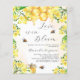 Um fundo branco na moda e ouro de cor d'água. Decorados com espécimes do gênero Bombus, melando mel e favos de mel com flores amarelas, flores e um pote de mel. Com o texto: O amor está no Bloom escrito com um moderno estilo escrito à mão. Personalize e adicione o nome da noiva. 1 folha = 1 convite impresso de borda a borda.