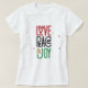 Amor, Paz e Joy - vermelho, preto e verde num fundo branco com brilhos